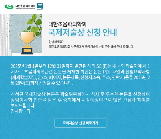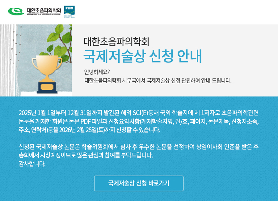 - 대한초음파학회 국제저술상 신청 안내 (신청마감일 2026년 2월 28일) 2026-01-06